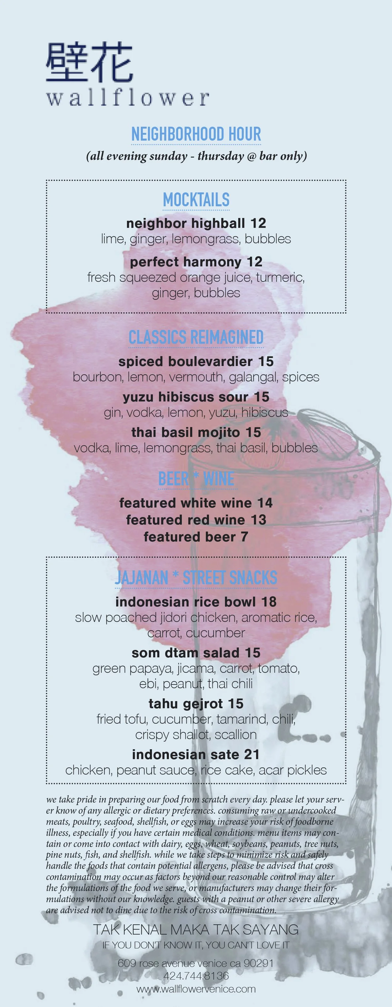 we welcome our locals, neighbors, and visitors for “neighborhood hour” featuring reimagined classic cocktails and mocktails paired with a few of our favorite street snacks, including chef brian Kim’s Indonesian rice bowl. served all evening long at the bar only from Sunday through Thursday.
